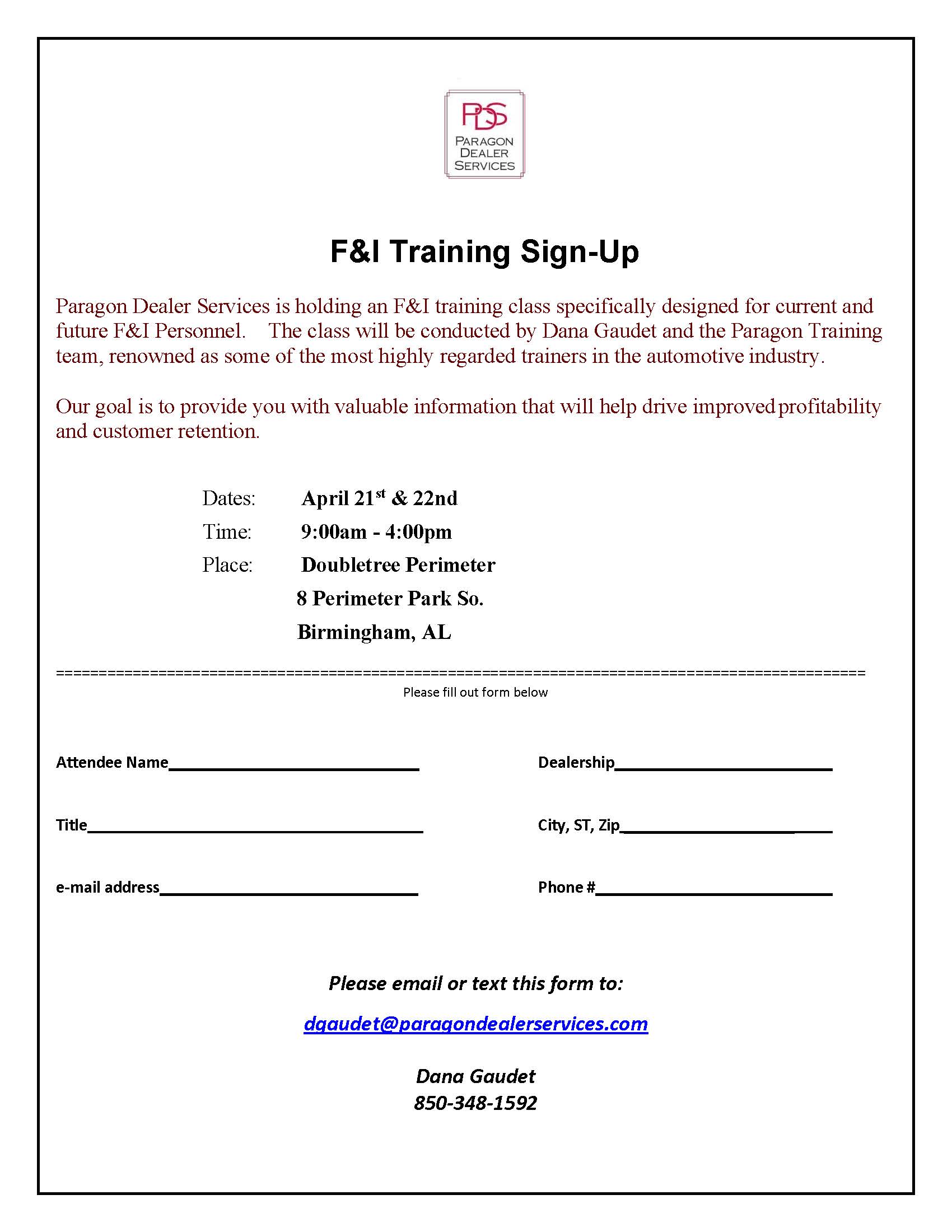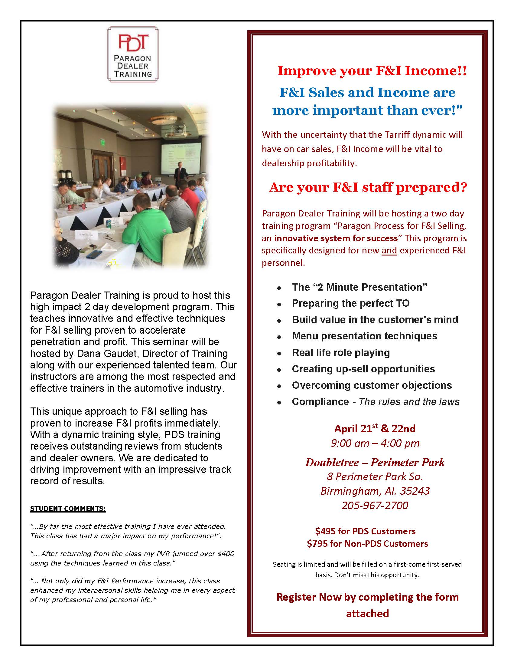 Upcoming Classes Great Products…Well Trained People Upcoming F&I Training class: April 21st & 22nd Birmingham, AL Register Online